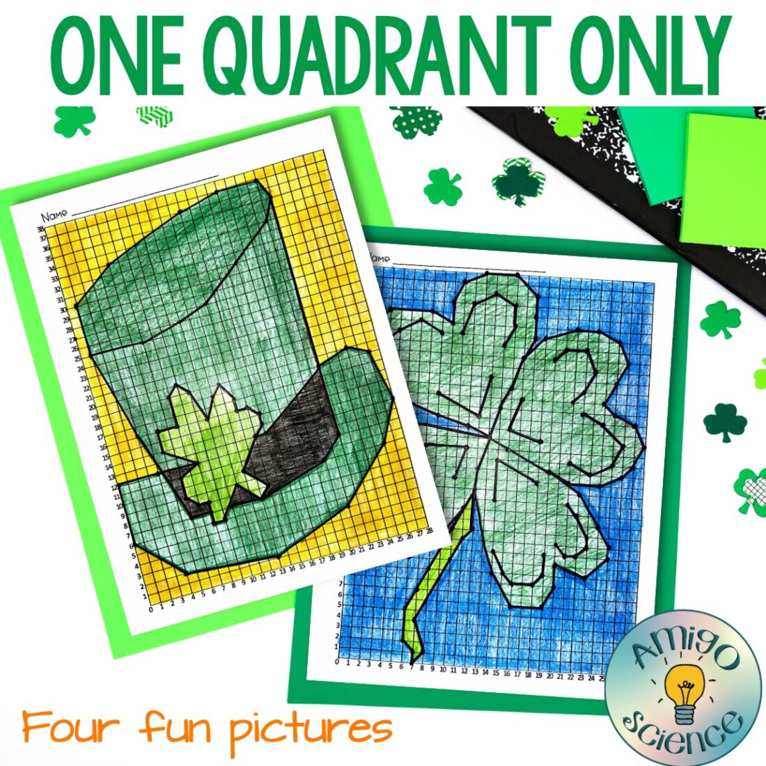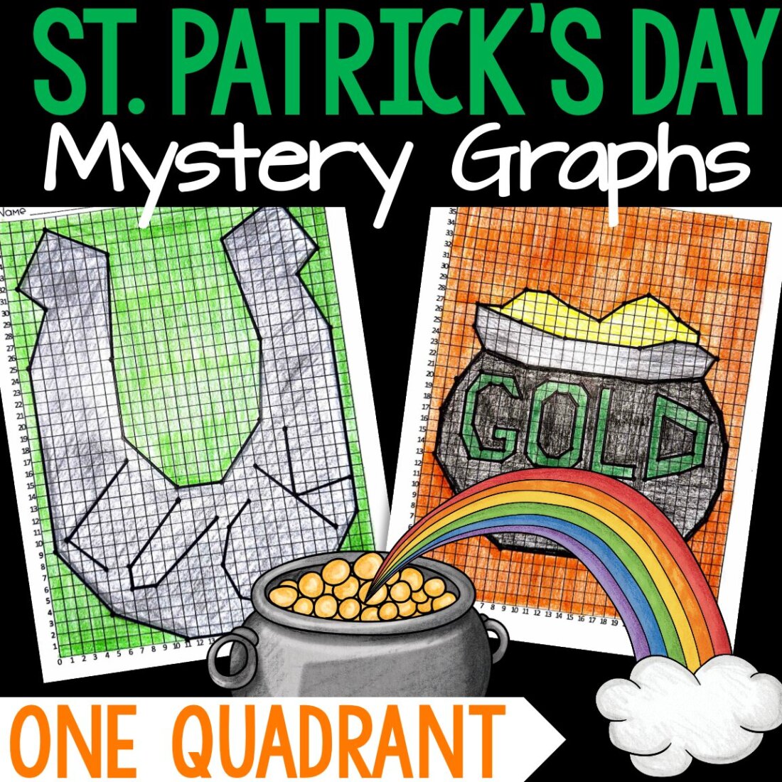 Your students will love strengthening their one quadrant graphing skills with these St. Patrick’s Day Mystery Graphs! This self-checking activity will reveal an appropriate St. Patrick’s Day picture if completed correctly. Then, students can color and hang them up in your room! Featuring FOUR different St. Patrick’s Day graphs, this resource allows for differentiation to meet the needs of all your students. The easiest graph has 45 points to plot, while the most advanced has over 100 points!